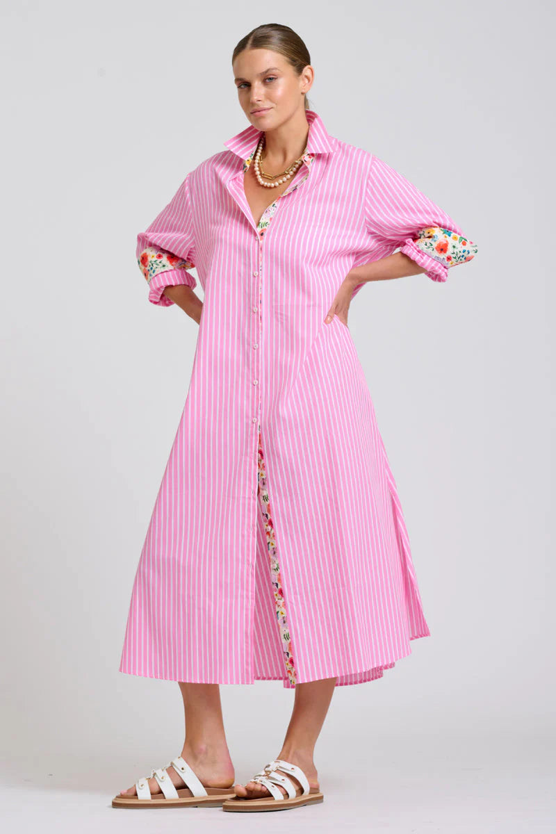 The Luna Oversized Long Line Shirt Dress Pink Stripe Floral Trim