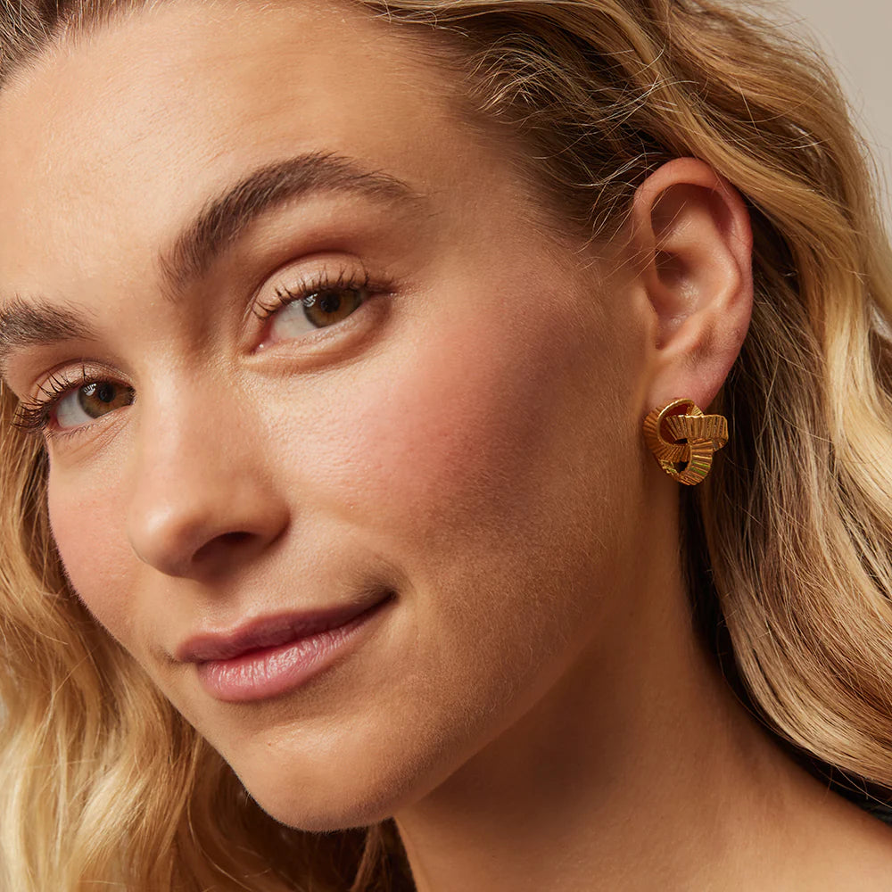 The Aviva Earrings feature a twisted gold design embossed with sparkling ridges around its face. A unique and modern design to complement a night out outfit.