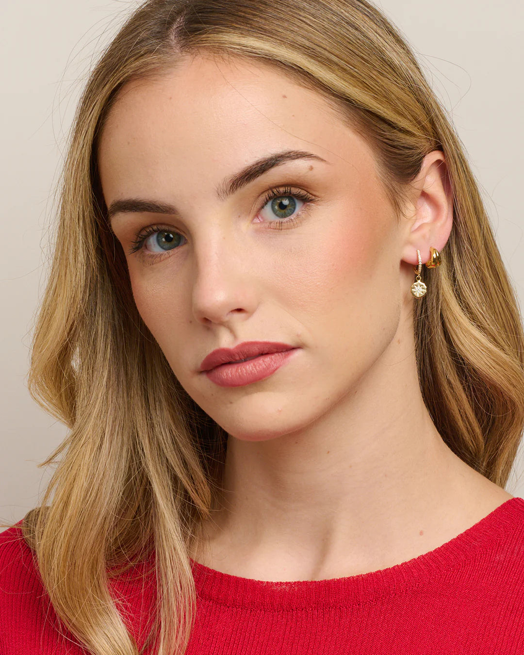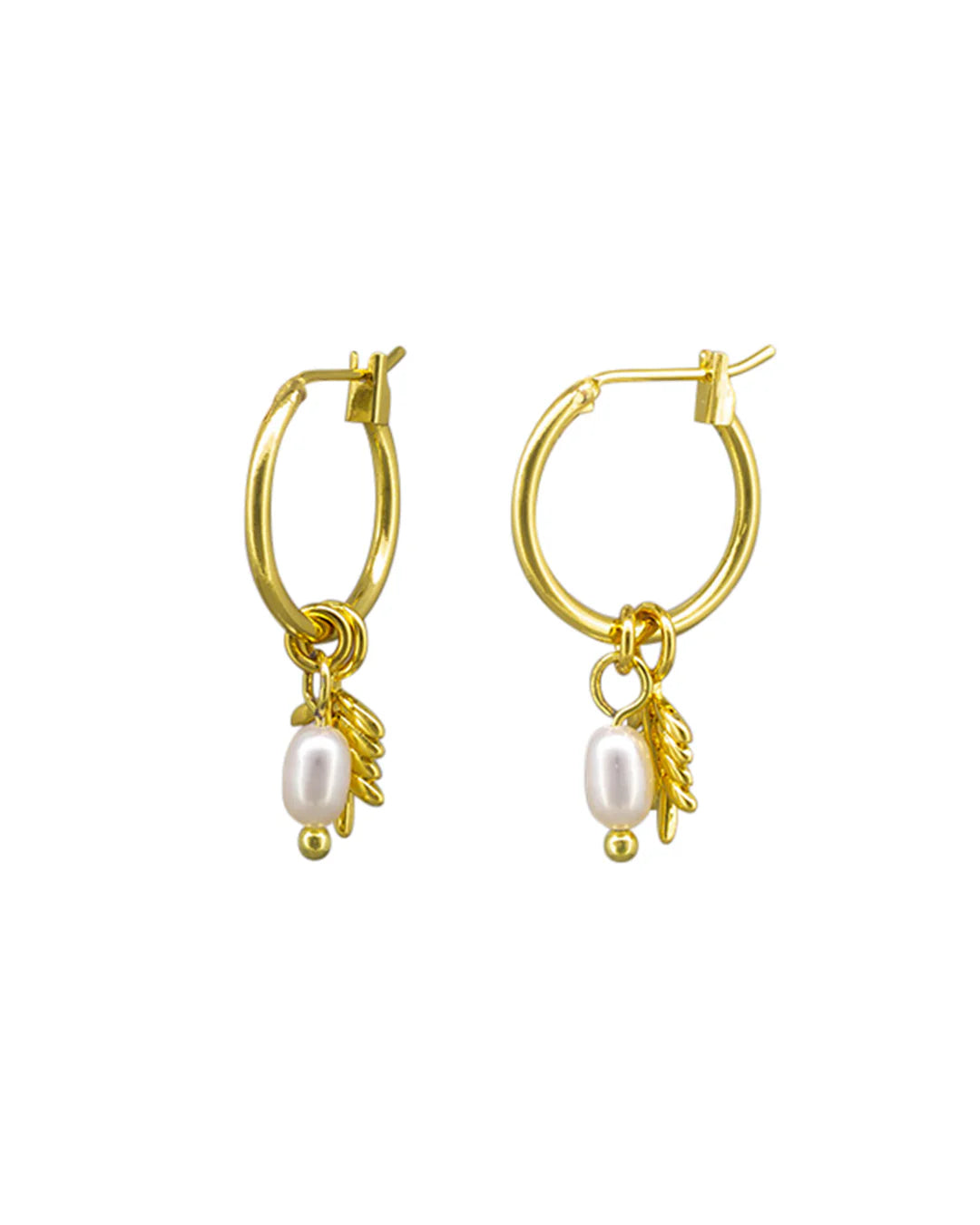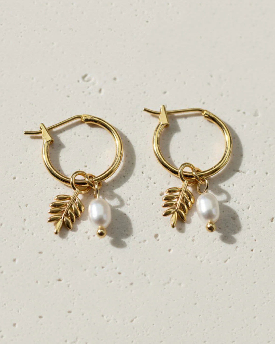 Lenora Hoops feature a timeless design with a delicate hanging leaf charm and pearl accent. These simple yet elegant hoops are perfect for everyday wear or special occasions. Effortlessly versatile, they pair beautifully with any outfit.