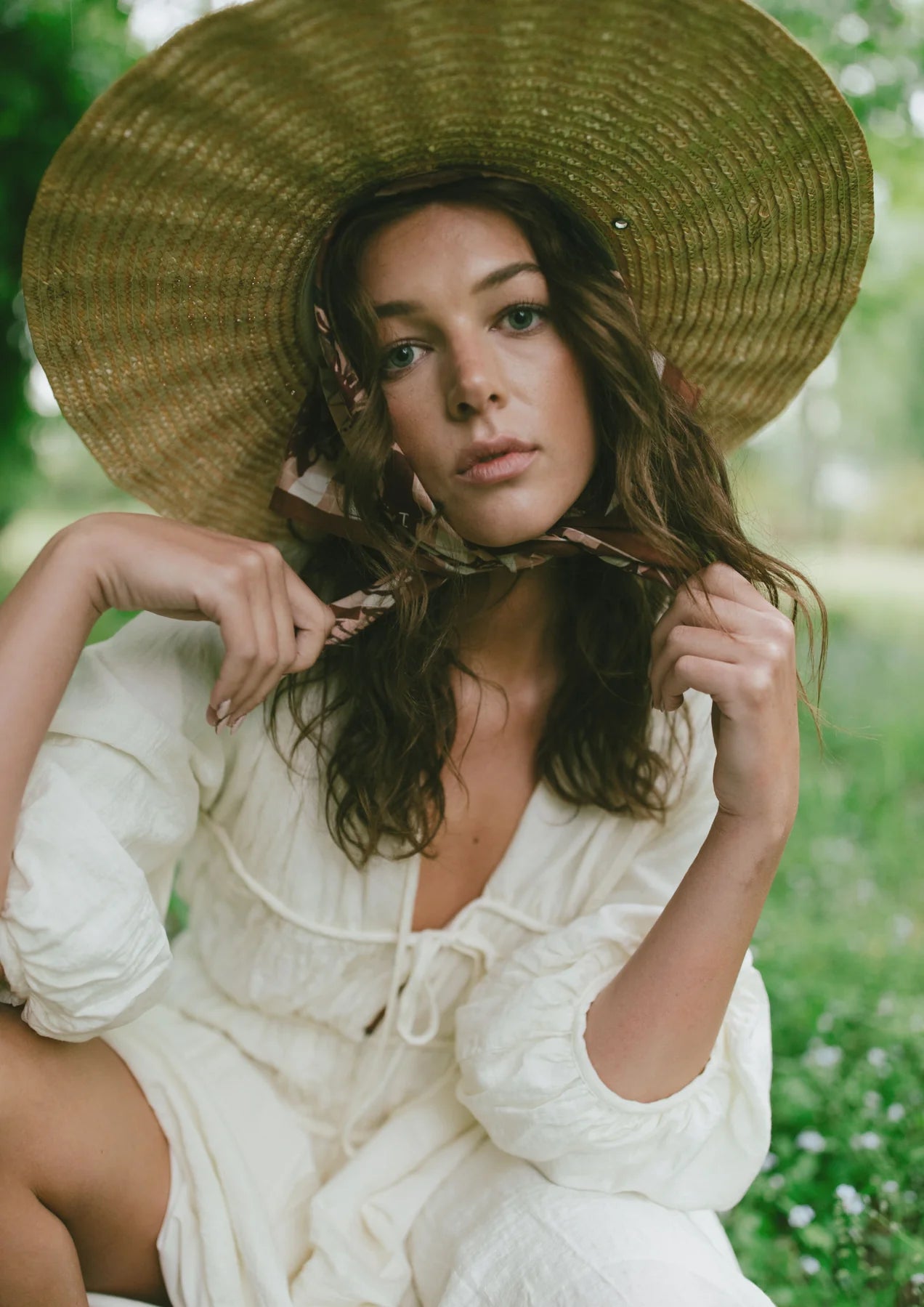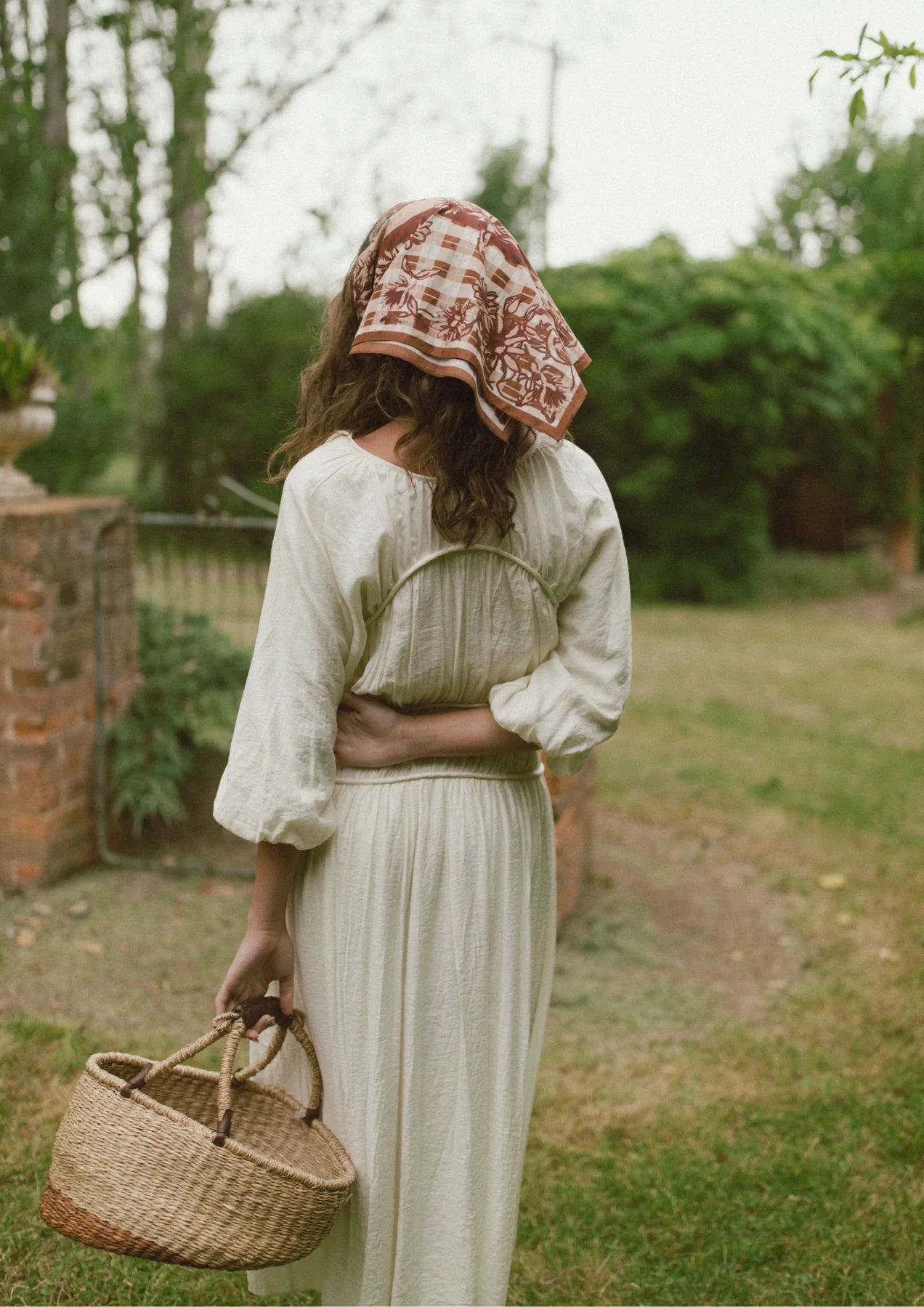 • Large Silk Scarf (90 x 90 cm): A versatile piece that can be worn in the hair, or—depending on body size—styled around the waist, draped over the shoulders, or across the chest.