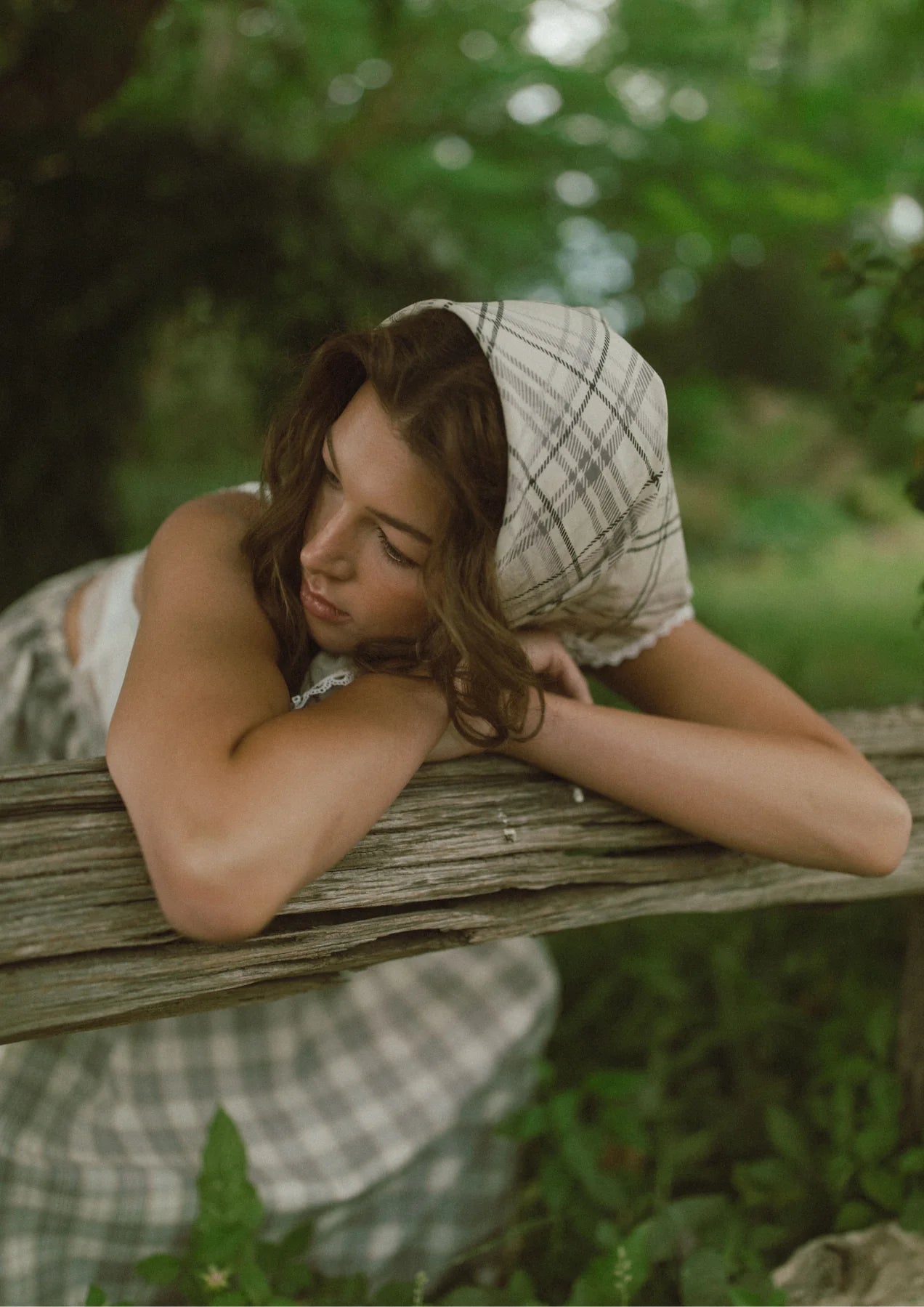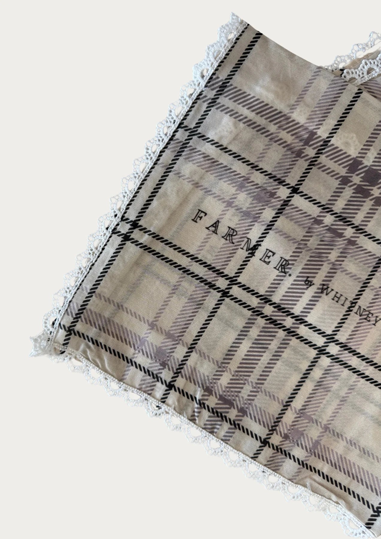 The Pasture Plaid Bandana/Scarf is a timeless accessory that blends FAR MER’s contemporary storytelling with heritage charm. Designed in neutral plaid tones and finished with FAR MER branding, this piece offers understated elegance with artisanal detailing.