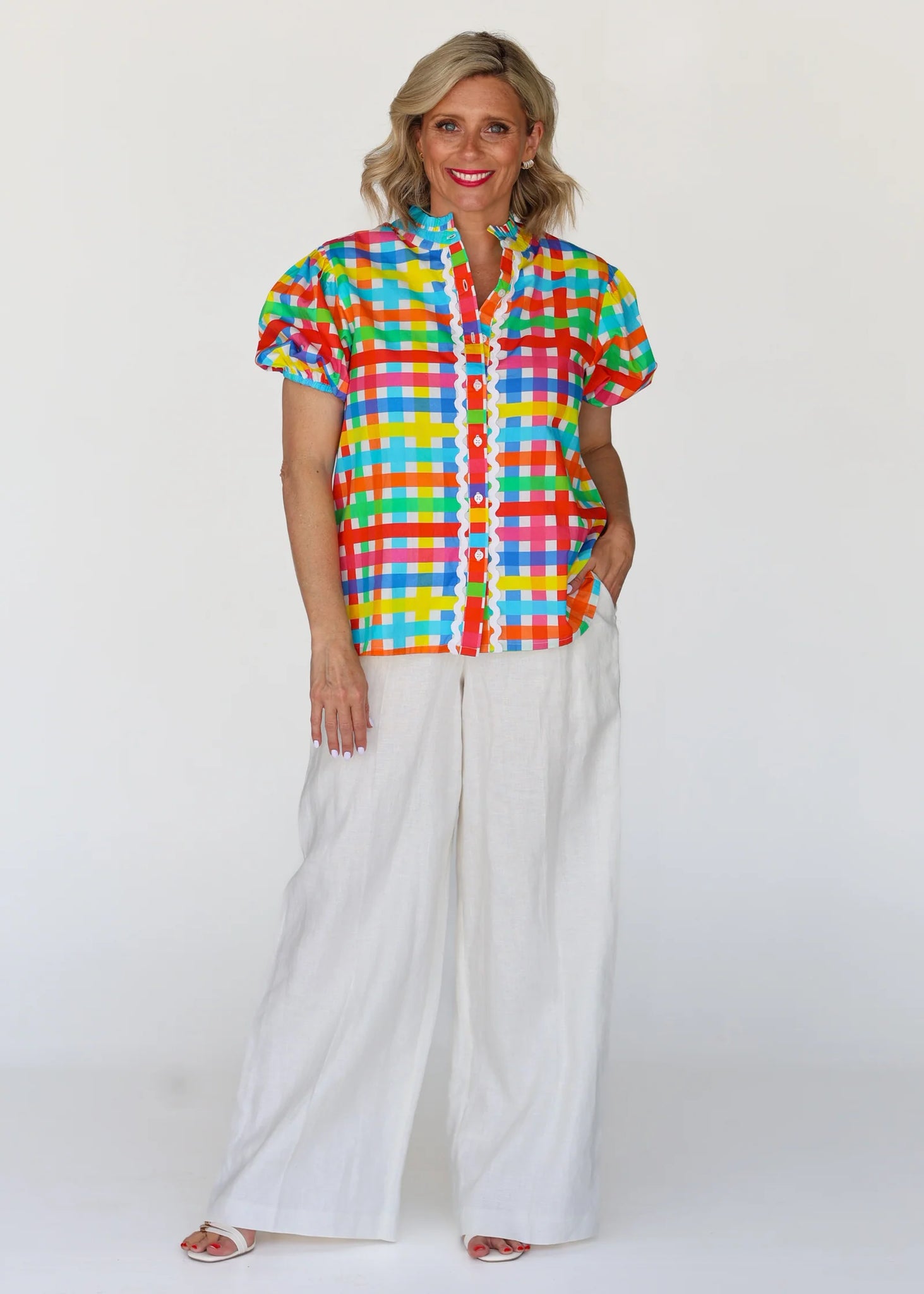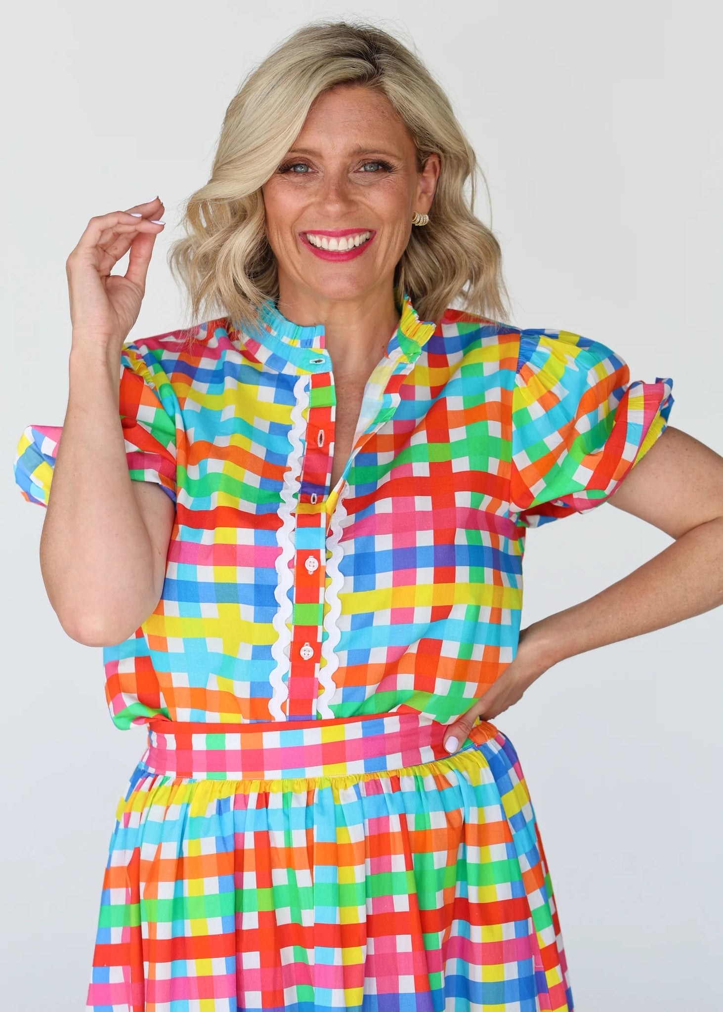Get ready to turn heads in Chloe! With its bold neon gingham design, this fabulous shirt features a button up front, puff sleeves and ric rac for a touch of whimsy. Made from 100% cotton poplin, this gorgeous shirt pairs perfectly with our Emma Skirt.